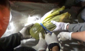 | ศพเด็กทารกเพศชายคลอดใหม่ ถูกถุงพลาสติกครอบหัว เชือกรัดคอจนสิ้นลม ทั้งที่ยังมีสายสะดือติดอยู่หน้าท้อง ก่อนนำไปทิ้งถังขยะหลัง รพ.อุตรดิตถ์ |